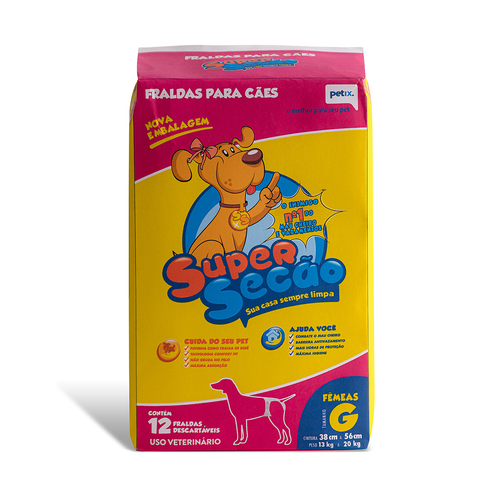 Fralda descartável indicada para cães fêmeas, ideal para uso durante passeios, viagens, pós-operatório, período de cio e incontinência urinária. Oferece super absorção e proteção contra vazamentos.