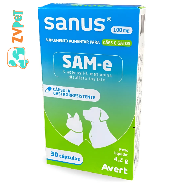 Sanus 100 mg 30 Cápsulas para Cães e Gatos da Avert é um suplemento alimentar formulado com S-adenosil-L-metionina (SAMe), indicado para auxiliar na manutenção das funções hepática, cerebral e articular de cães e gatos. Cada cápsula contém 100 mg do princípio ativo em forma gastrorresistente, o que garante maior absorção e eficácia. Recomendado especialmente para animais com distúrbios hepáticos, envelhecimento cerebral ou como suporte antioxidante. Deve ser administrado por via oral, conforme orientação do médico-veterinário. Uso exclusivo em cães e gatos.